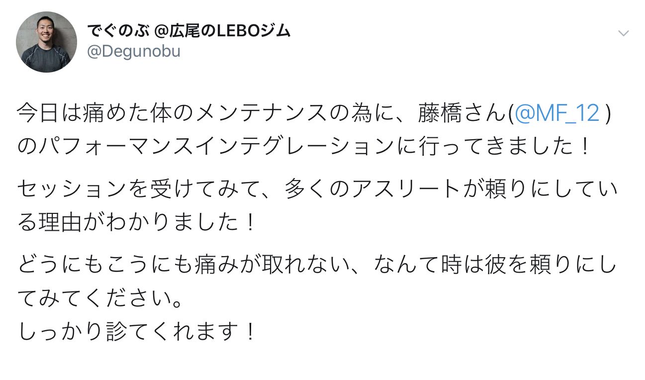 出口くんですが、広尾でLEBOコンディショニングサロンというパーソナルトレーニングのジムを経営しています。とてもオシャレなスタジオです。出口くんはアメリカのATCだけでなく、日本スポーツ協会のアスレティックトレーナーの資格を持っているJSPO-ATでもあります。日本の大学で学んだ後、アメリカの大学でも学んだので日米両方のアスレティックトレーニング事情に詳しいです。日米両方でトレーニングを積んできたのは素晴らしいです。是非、広尾にあるLEBOで出口くんのパーソナルトレーニングを受けてみてください。